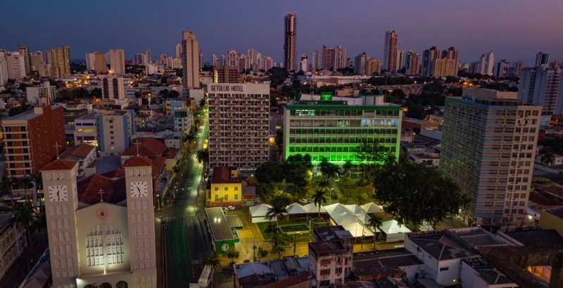 Vista aérea noturna do Palácio do Alencastro, Prefeitura de Cuiabá. Foto: Divulgação