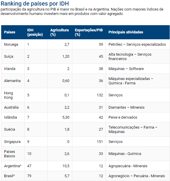 Na tabela acima se encontram os 10 primeiros países que alcançaram melhor posição pelo IDH em 2018 juntas com as duas nações mais importantes da América do Sul. A coluna central indica a participação da agricultura no PIB de cada país. Excluindo a Islândia, que desenvolve fortes atividades de pesca marítima e é um país pequeno, a importância da agricultura em todos os outros não alcança nem metade da correspondente no Brasil e menos ainda da Argentina. Como nenhum dos 2 tem exportações significativas de produtos e serviços, além de se centrarem na agropecuária e minerais como principal atividade, o modelo de desenvolvimento econômico de ambos os Estados sul-americanos é de baixo valor agregado.