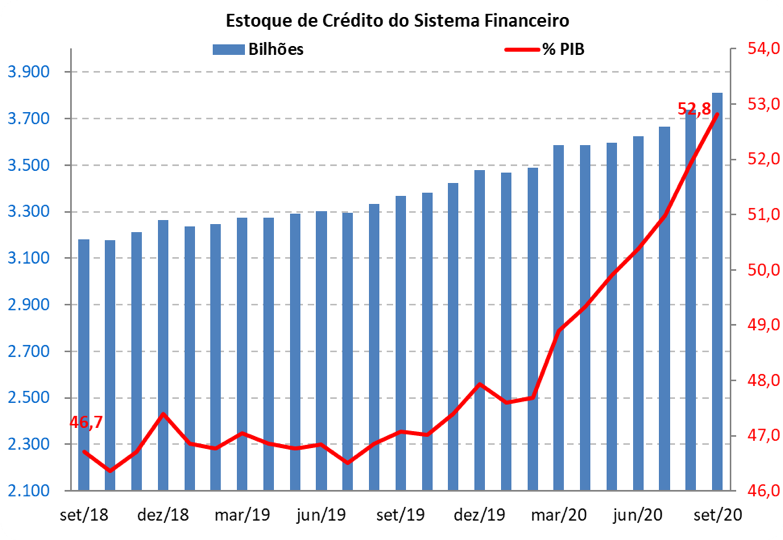 De acordo com dados do BCB, as operações totais de crédito no SFN com recursos livre e direcionados chegaram a 52,8% do PIB, e acumula crescimento real de mais de 8% em 2020. O estoque de crédito às pessoas físicas é da ordem de 29,4% do PIB, enquanto às pessoas jurídicas, a proporção é de 23,4%.